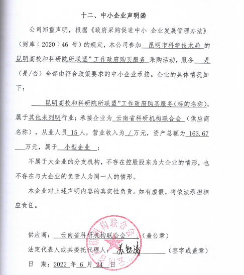 后附:云南省科研机构联合会提供的小微企业证明材料