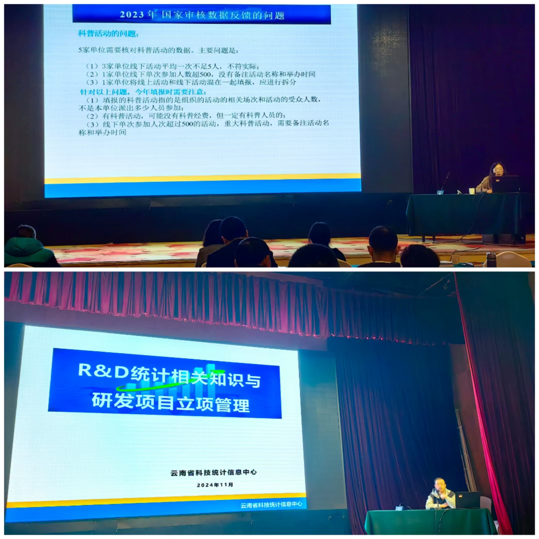 会上,市科技局战略规划处处长孙荔莎通报了2023年度全市研发投入完成情况并布置2024年度工作任务、科技成果促进转化处田秀山调研员通报了科技服务业年度统计系统填报情况、市科技局民办机构管理处处长万洋讲解了昆明市企业研发费用加计扣除项目鉴定工作流程;市科技统计信息中心副主任代文琼对科普统计相关知识及数据审核要点进行详细讲解;会议还邀请省科技统计信息中心钟翔研究员围绕R&D统计相关知识、研发项目立项管理、统计调查常见问题等内容开展专题培训。