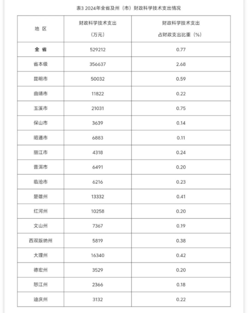 2024年,全省16个州(市)财政科学技术支出超过1亿元的有6个,分别为昆明市(5.00亿元)、玉溪市(2.10亿元)、大理州(1.63亿元)、楚雄州(1.33亿元)、曲靖市(1.18亿元)和红河州(1.03亿元);1亿元至5000万元的有5个,分别为文山州(7367万元)、昭通市(6883万元)、普洱市(6491万元)、临沧市(6216万元)、西双版纳州(5819万元);5000万元以下的有5个,分别为丽江市(4318万元)、保山市(3639万元)、德宏州(3529万元)、迪庆州(3132万元)、怒江州(2366万元)(详见表3)。