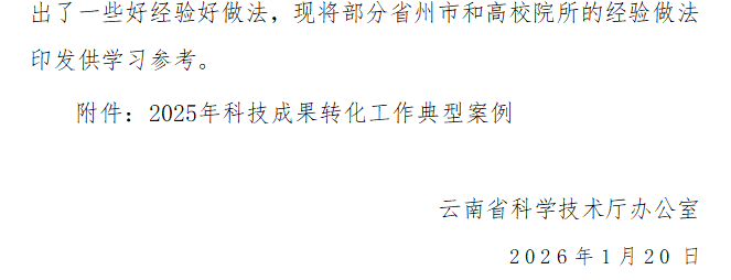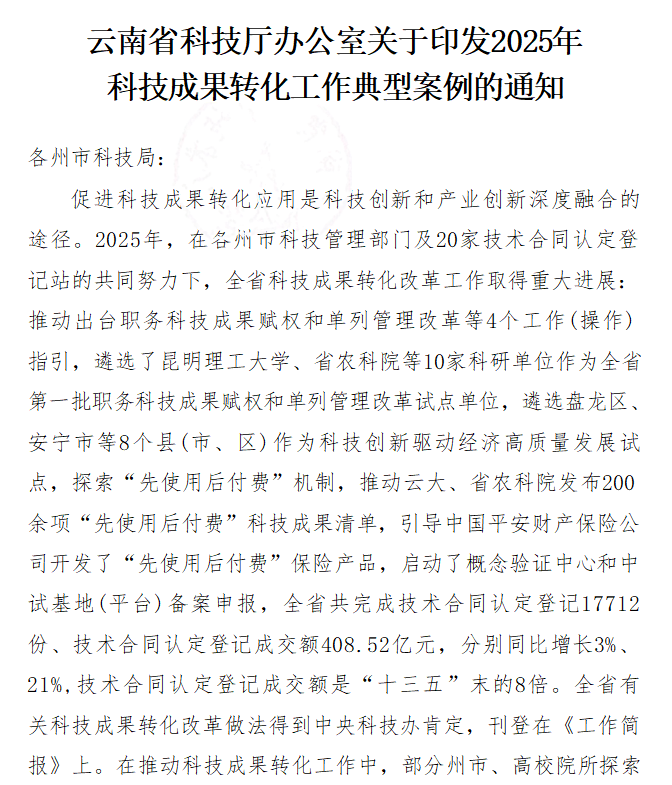 2025年,云南省有关科技成果转化改革做法得到中央科技办肯定,并刊登在《工作简报》上。昆明市科学技术局及昆明市技术合同认定登记站共同努力,2025年全市科技成果转化改革工作取得重大进展,并成功入选2025年成果转化工作典型案例。